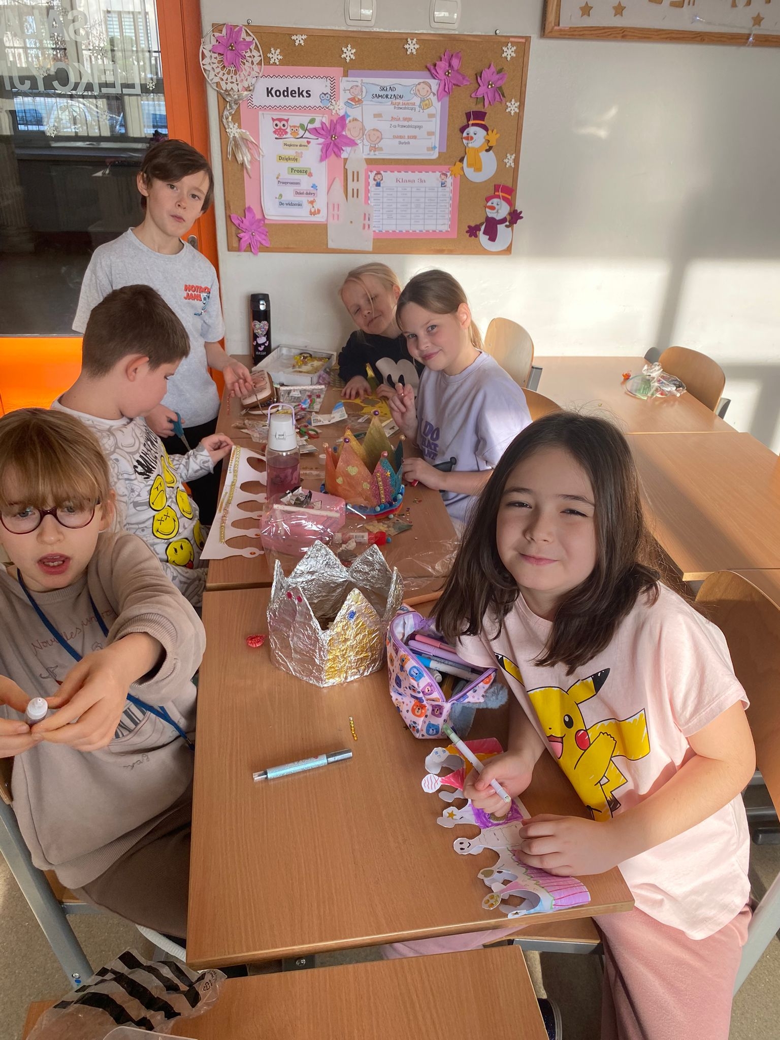 Szablony zostały przygotowane w domu, a podczas zajęć uczniowie wspólnie ozdabiali swoje prace, wykazując się kreatywnością, starannością i dużym zaangażowaniem. 🎨✨
